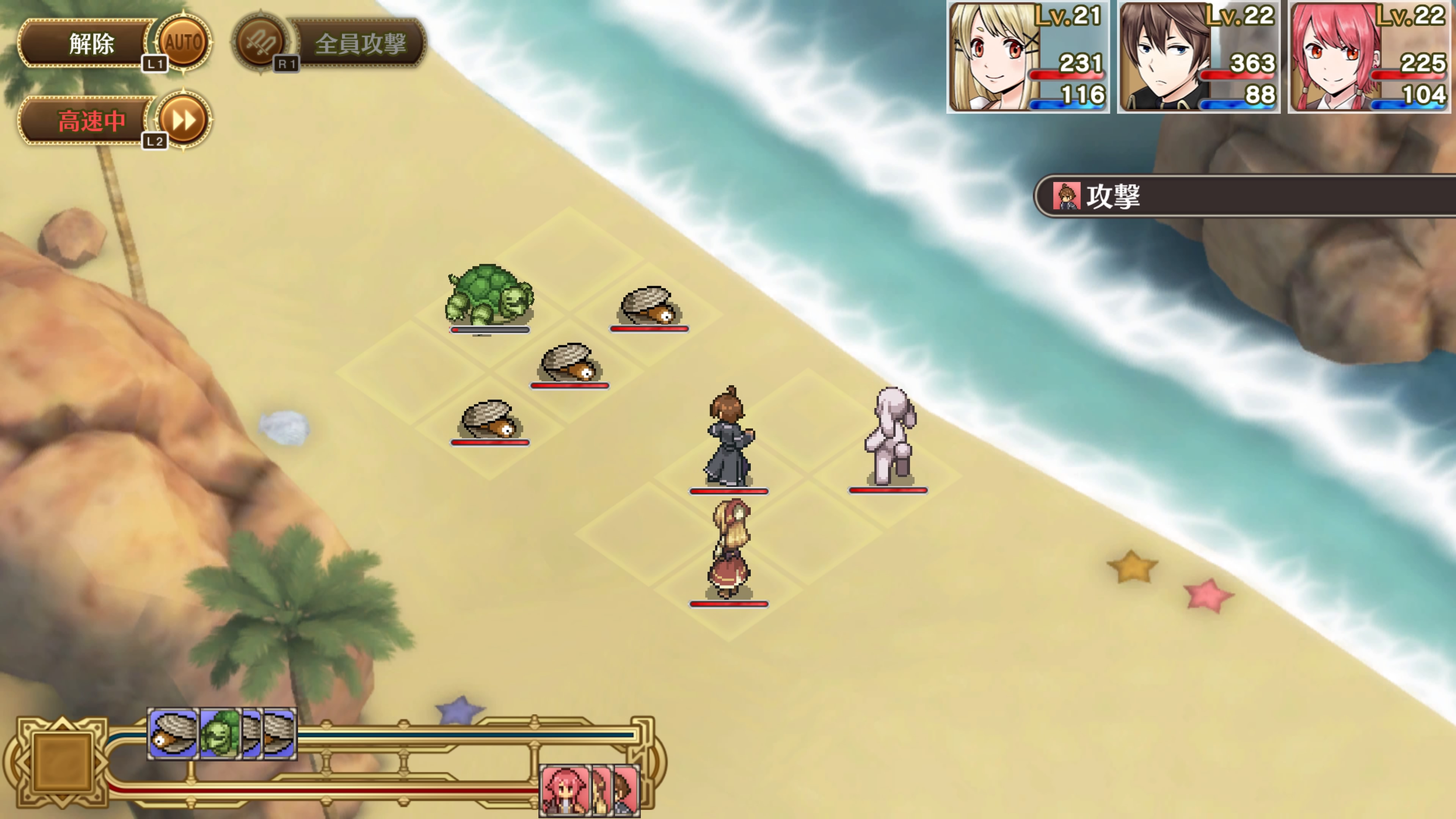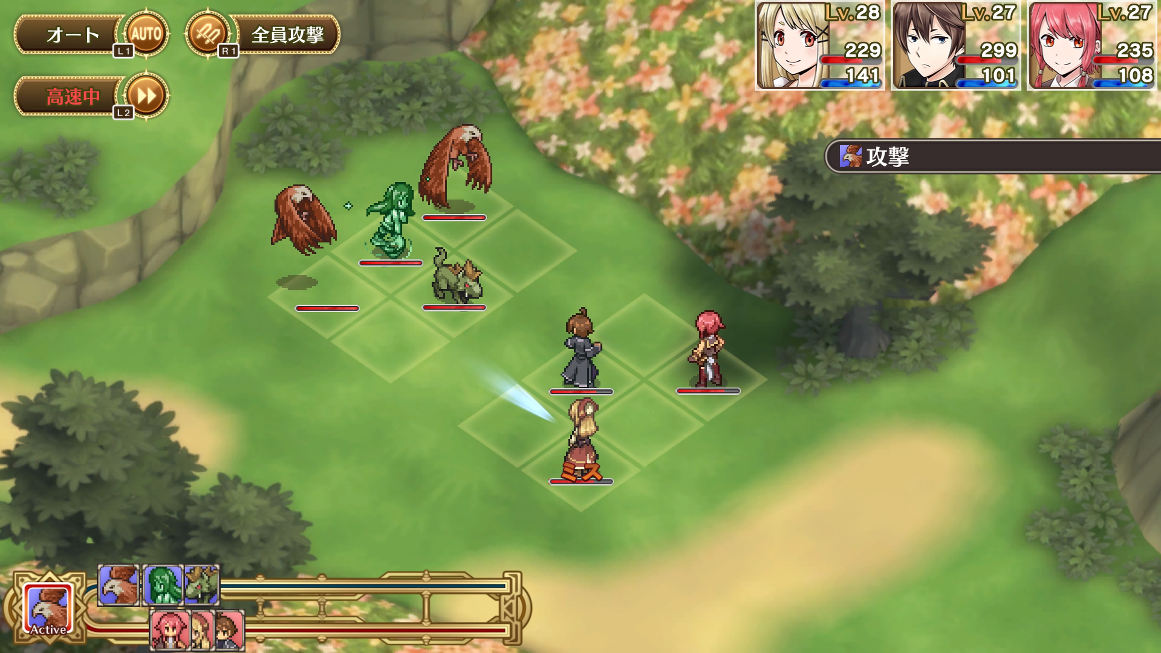 배틀은 직접 턴이 돌아와 공격, 방어, 아이템등을 활용가능하지만 자동 전투가 존재하기에