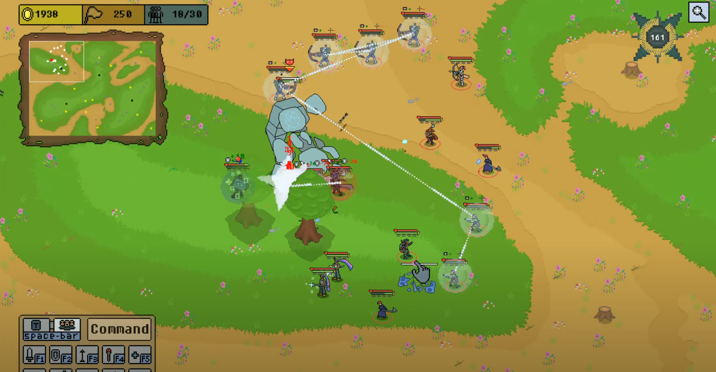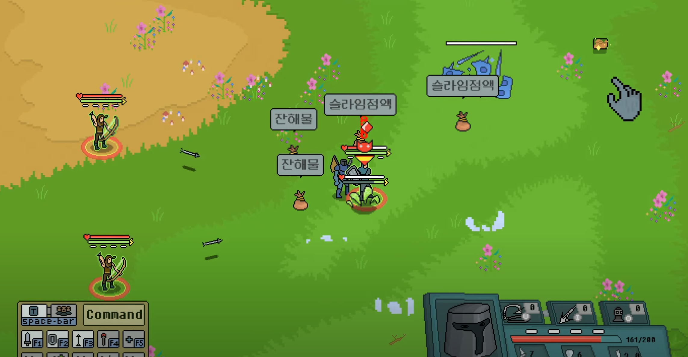 공격, 정지, 후퇴, 탐색, 시너지를 활용하여 전략적인 움직임을 지정가능합니다.