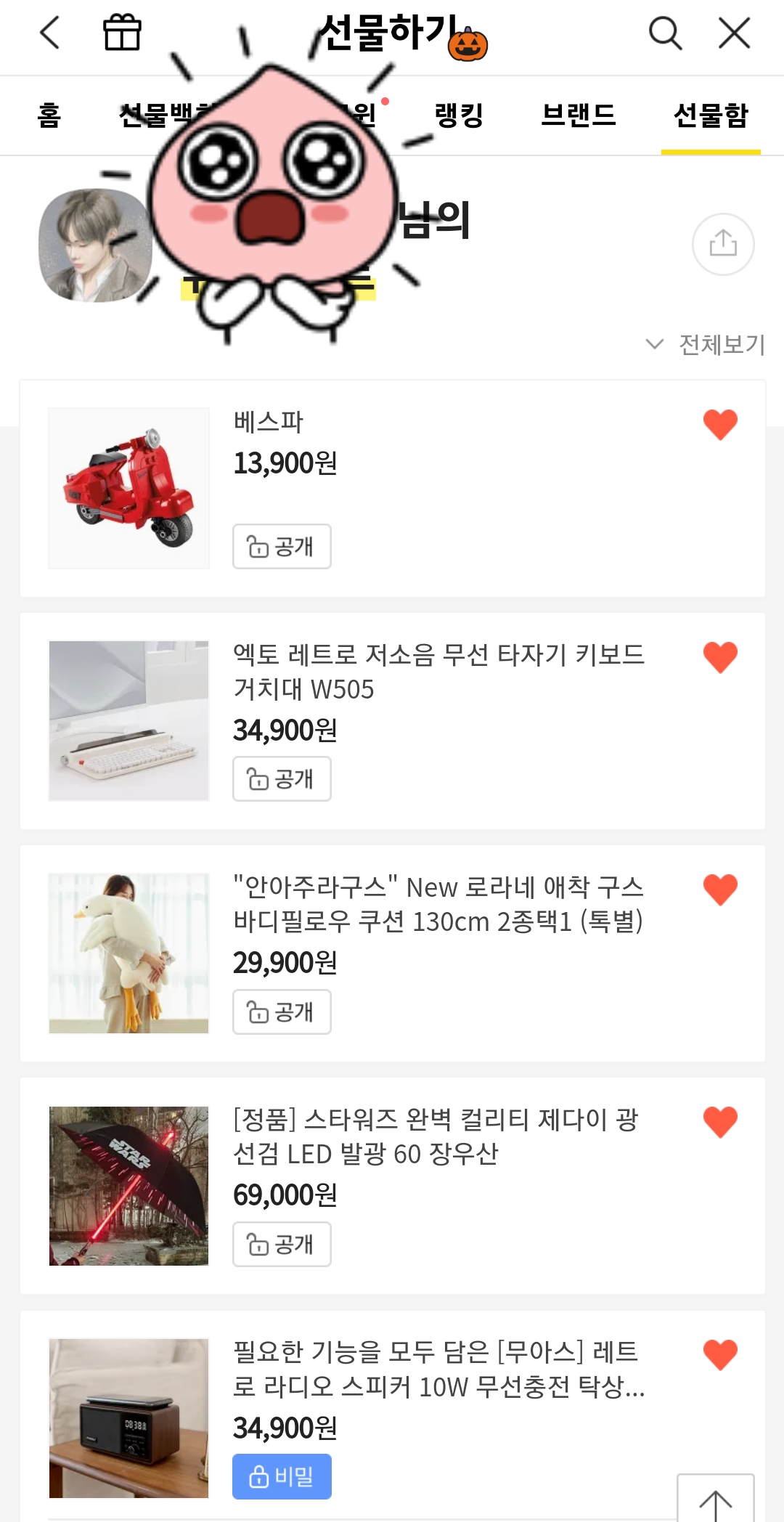 카톡에 등록된 친구라면 상대방이 위시리스트에 담아둔 물건이