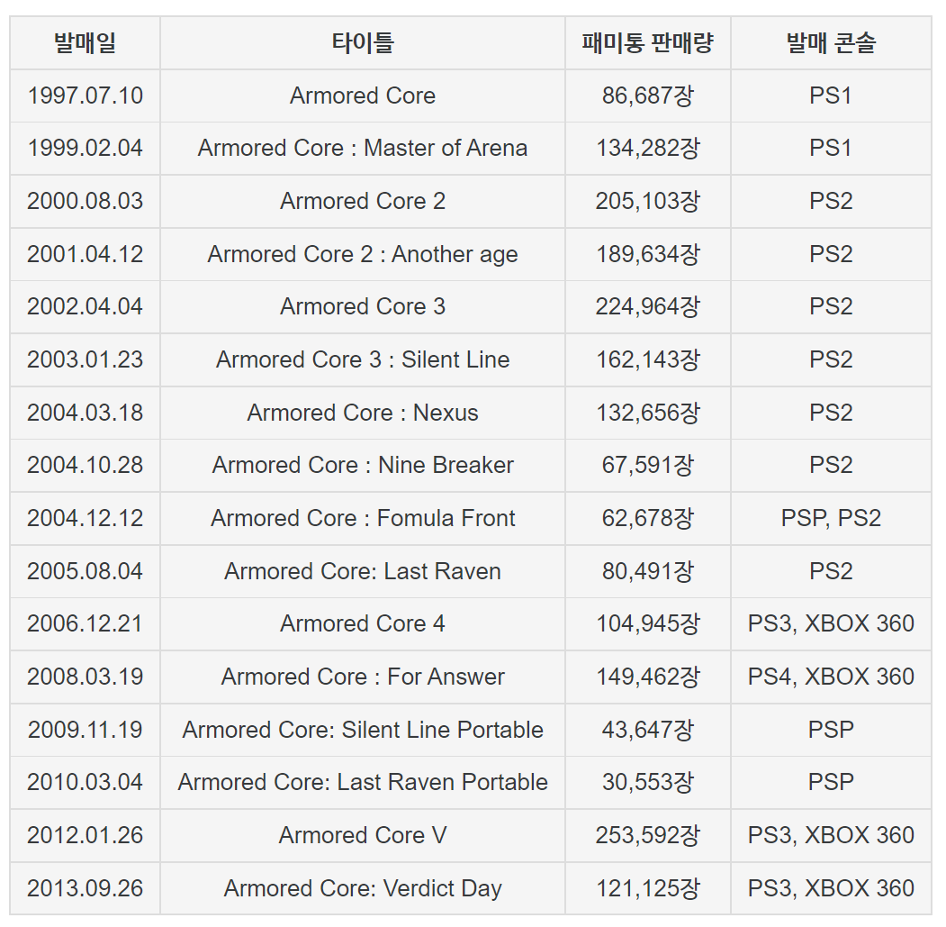 20만장을 돌파했으며 최고기록은 이후 설명할 아머드코어5편이 25만장을