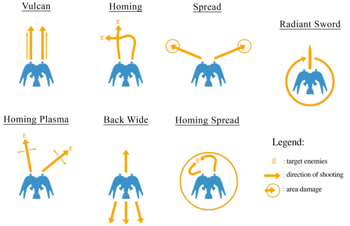 | 호밍 | B | 탄속이 늦지만 적을 추적하는 탄을 발사 위력은 낮지만 유도성능이 좋음 |