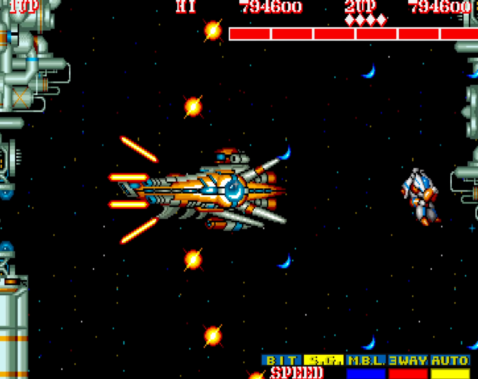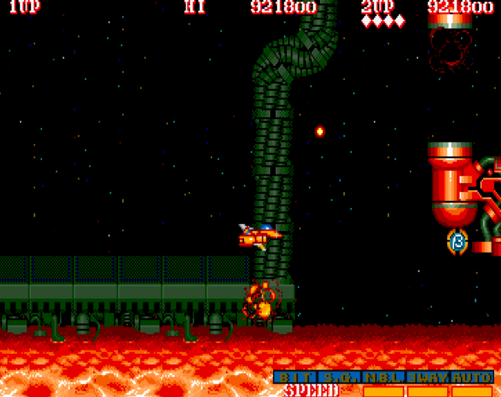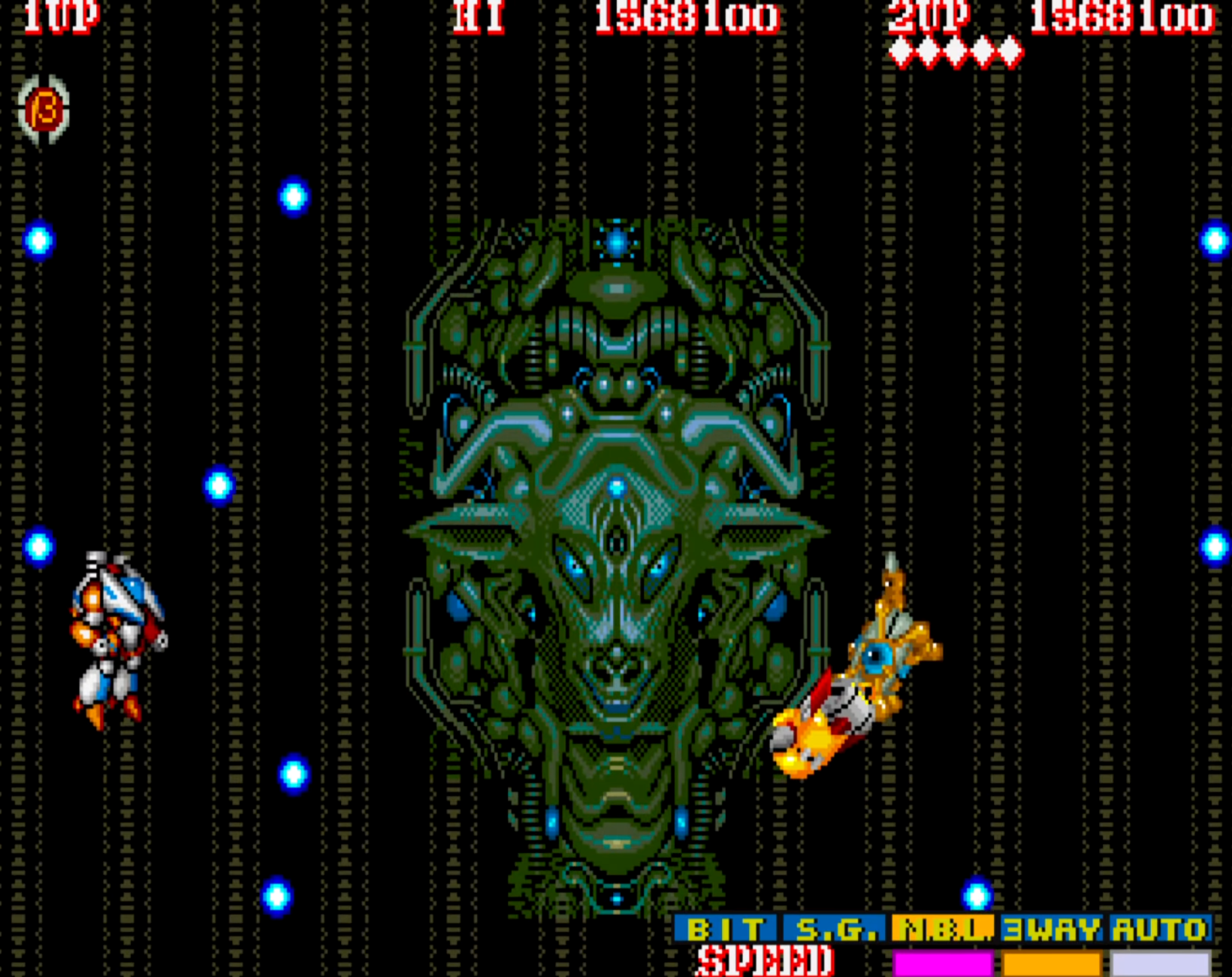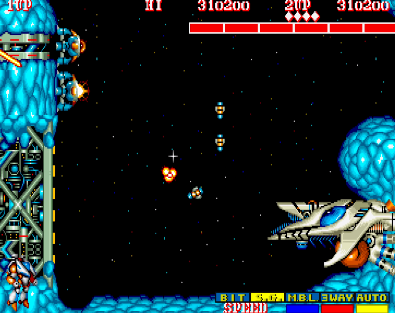 이 게임을 해본 유저라면 누구나 알고 있는 비기이자 버그는 합체한 상태에서 슈팅 버튼을 누르면 8 WAY 샷이 나가고
